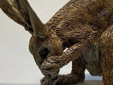Ceramic reclining hare,14cm long Cold-finished with acrylic Ink detail and bronze leaf.